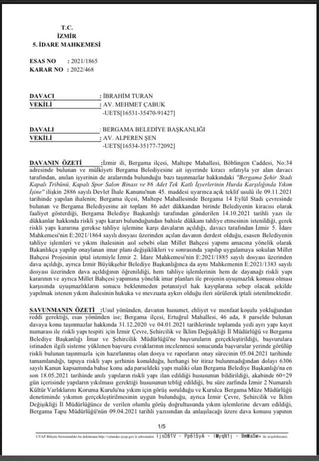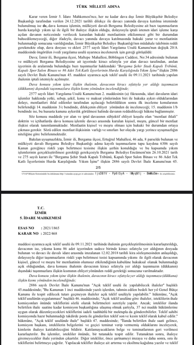 Belediye tarafından, Millet Bahçesi yapımına yönelik olarak Stad ve çevresindeki dükkanların yıkımı için apar topar yapılan yıkım ihalesinin iptali istemiyle İzmir 5. İdare Mahkemesinin 2021/1865 dosyasına dava açmış ve Mahkeme bu davada 23.02.2022 tarihli, K:2022/468 sayılı karar ile “…riskli yapı tespiti ve tahliye işlemine dair sürecin kesinleşmesi akabinde yıkım ihalesi yapılması gerektiği” gerekçesiyle ihalenin iptaline karar vermiş ve bu karar 01.03.2022 tarihinde Belediyeye tebliğ edilmiştir.