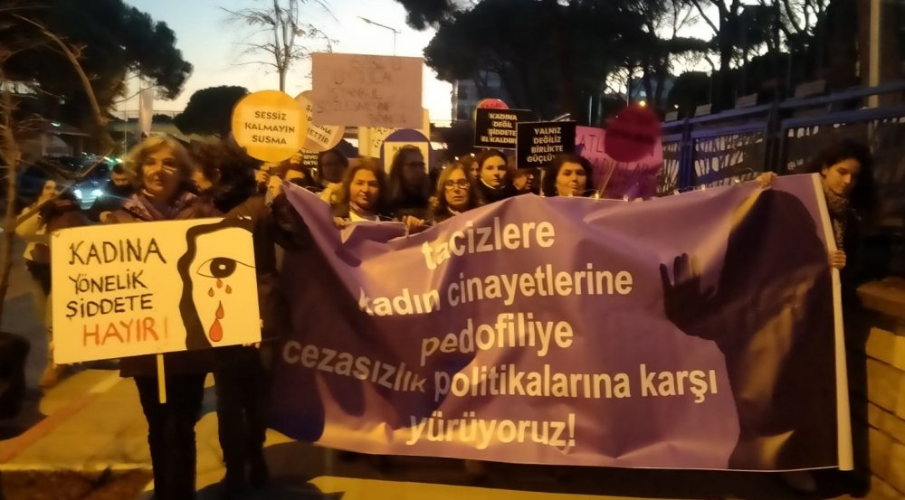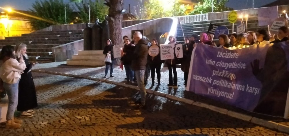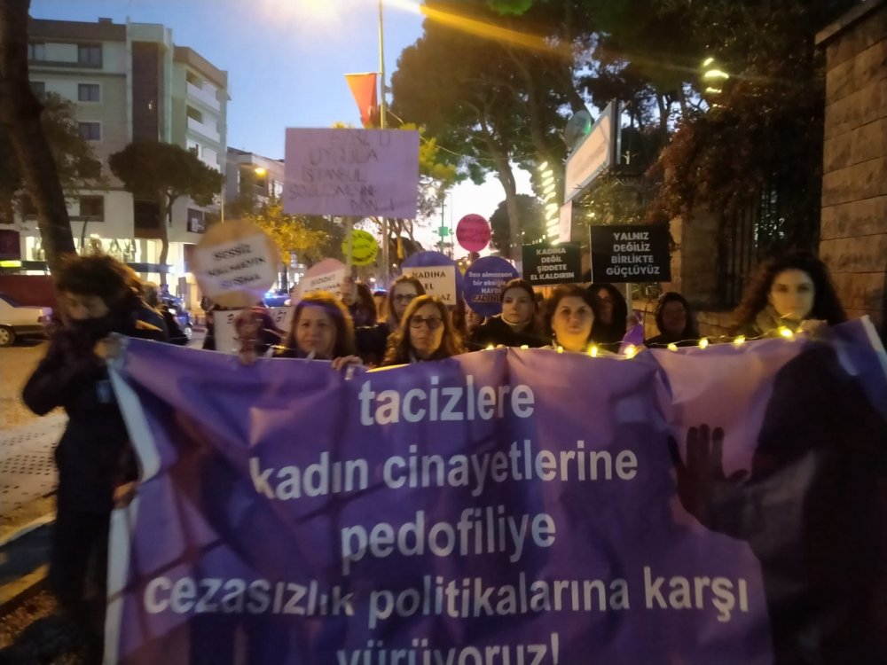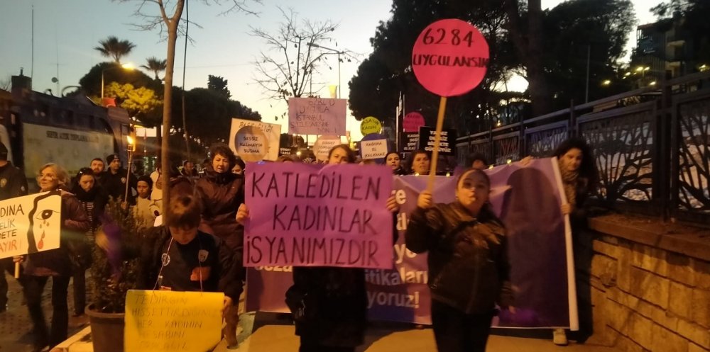 Açıklamada ayrıca; “Cinsiyet eşitsizliğini besleyen siyasi iktidara ve kadın düşmanı politikalarına, egemen zihniyetin yarattığı erkek adalete, kazanılmış haklarımızın gerici zihniyetle gasp edilmesine, kadınların yaşamlarını koruyan İstanbul Sözleşmesinden keyfice –hukuksuzca çıkılmasına, 6284 sayılı kanunun etkin uygulanmamasına, kutsal aile yalanlarıyla bizleri eve hapsetmeye çalışan zihniyete, faillerin cezasızlıkla ödüllendirilmesine karşı mücadeleyi büyütmek için toplandık”
