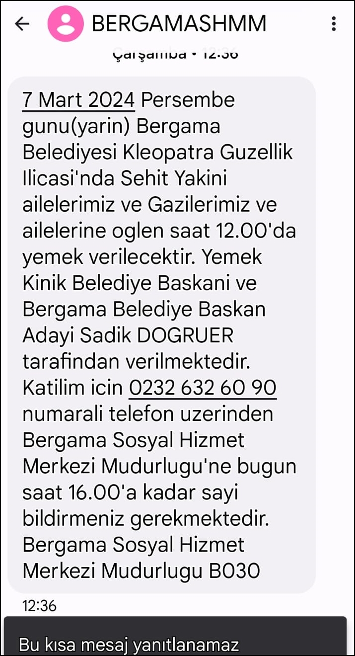 İz Gazete'den Gizem Taban Şeber'in haberine göre Bergama Kaymakamlığı Sosyal Hizmetler Müdürlüğü tarafından; Kınık Belediye Başkanı ve AKP Bergama Belediye Başkan Adayı Sadık Doğruer’in düzenlediği bir etkinlik için vatandaşa SMS gönderildi. Mesajda; Bergama Belediyesi Kleopatra Güzellik Ilıcası’nda şehit yakını ile gaziler ve ailelerine AKP Bergama Belediye Başkan Adayı Sadık Doğruer tarafından verilecek öğlen yemeği duyuruldu. Katılmak isteyenlerin Bergama Kaymakamlığı’na ait Sosyal Hizmet Merkezi Müdürlüğü’ne bildirim yapması istendi. AKP Adayı Doğruer’in seçim propagandasını kamu kurumu vasıtasıyla yürütmesi tepki çekti.