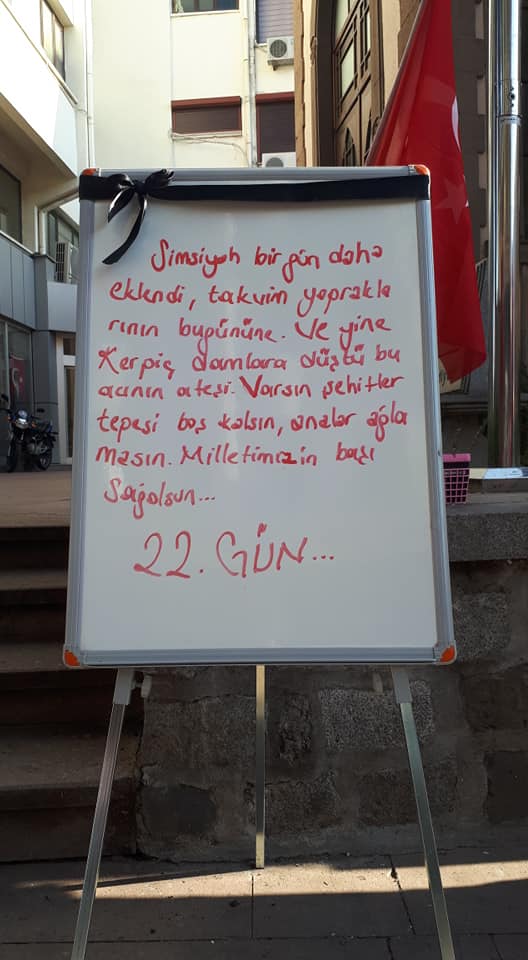 Eylemlerinin 22’inci günün Bergama Belediyesi önünde hak arama eylemlerini sürdüren 3 kadın işçi, Suriye’nin İdlip kentinde yaşanan saldırı sonucu hayatını kaybeden şehit ve yaralılar nedeniyle sessiz eylem gerçekleştirdiler. Eylem tahtasına ise; “Simsiyah bir gün daha eklendi, takvim yapraklarının bugününe. Ve yine kerpiç damlara düştü bu acının ateşi. Varsın şehitler tepesi boş kalsın, analar ağlamasın. Milletimizin başı sağ olsun. 22.gün…” notunu düştüler.