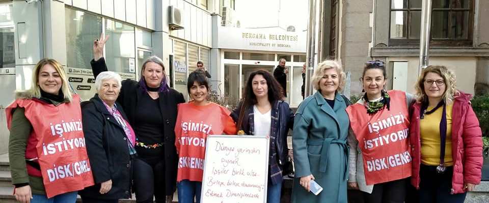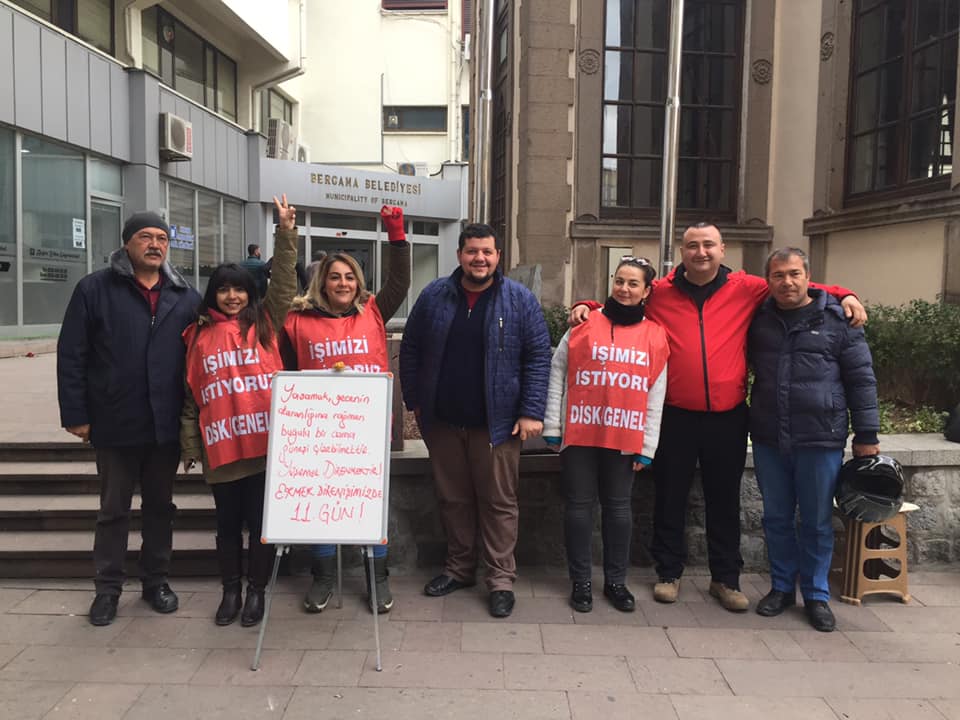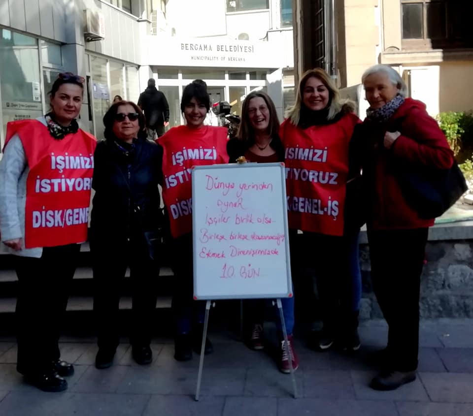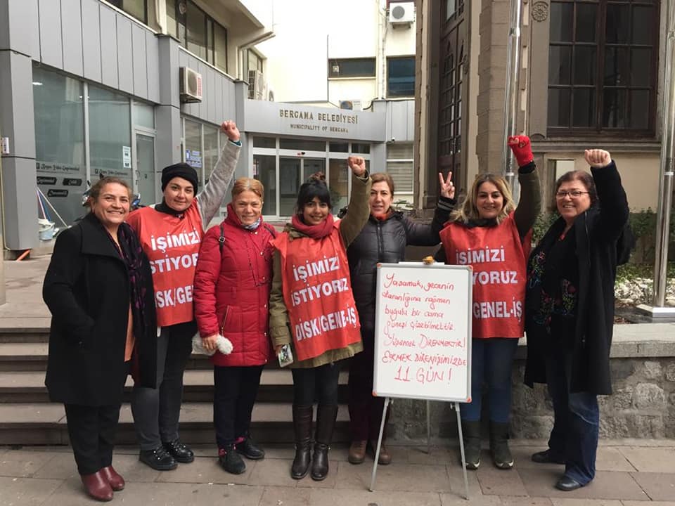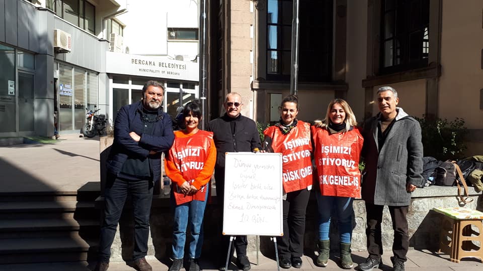 Direnişlerinin 12.gününde üzerlerinde “işimi istiyorum” yazılı yeleklerle hak arama gerekçesiyle direnişlerini sürdüren işçileri Bergama Demokrasi Platformu Üyeleri, Bergama’da ki sivil toplum kuruluşları ve vatandaşlar yalnız bırakmıyor. 3 Kadın işçiye çevre il ve ilçelerden de destek ziyaretleri devam ediyor. Bu kapsamda DİSK Genel-İş İzmir 7 No’lu Şube yöneticileri, Soma Bağımsız Maden-İş Sendikası, Sol Parti, Dikili Emek ve Demokrasi Platformu, Dikili Kadın Platformu üyeleri ve Dikili'nin eski belediye başkanı Osman Özgüven de 3 kadın işçi Deniz, Alev ve Gonca’yı ziyaret etti.