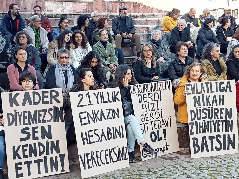 Cumhuriyet Meydanı’nda yapılan etkinlikte “Kurduğunuz dünya koca bir enkaz. Eşit dünyayı dayanışmamızla kuracağız” yazılı pankart ile “Hakkımızı helal etmiyoruz”, “Kader diyemezsin sen kendin ettin”, “21 yıllık enkazın hesabını vereceksin”, “Uçkurunuzun derdi bizi gerdi, git tedavi ol. @diyanet”, “Evlatlığa nikâh düşüren zihniyetiniz batsın”, “İstifa yetmez, tek tek yargılanacaksınız”, “Soracak hesabımız, yeniden kuracak gücümüz var”, “Asrın kötülüğüne karşı, asrın dayanışması” ve “Enkazdan sağ çıkan çocuklar nerede?” yazılı dövizler açıldı.