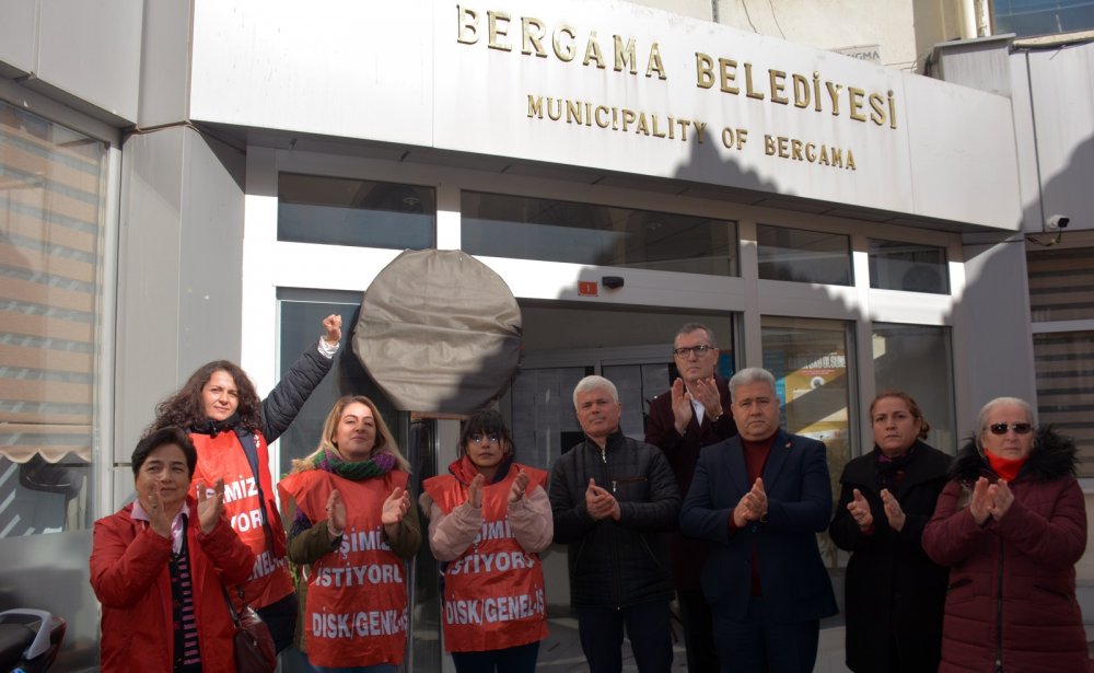 İşten çıkarılan 3 kadın Nazlı Deniz Tan, Alev Çakır ve Gonca Çetin “İşimizi İstiyoruz” yazılı yeleklerle Belediye’nin önünde sabah saatlerinde eyleme başladı. Üç kadın çalışana CHP Bergama İlçe Başkanı Ecevit Canbaz, DİSK Genel Sekreteri Şükret Sevgener, Bergama'nın önceki dönem Belediye Başkanı CHP’li Mehmet Gönenç, Dikili'nin eski Belediye Başkanı CHP’li Osman Özgüven ile çok sayıda vatandaş belediyeden çıkarılan işçilere alkışlarla destek verdi. Yapılan basın açıklamasının ardından belediye kapısı önünde arbede yaşanırken, işten çıkarılan kadınlardan Alev Çakır’ın babası Durmuş Çakır tartaklandı.