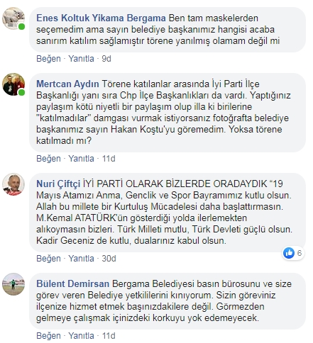 19 Mayıs Atatürk’ü Anma Gençlik ve Spor Bayramı dolayısıyla Hükümet Konağı önünde tören düzenlendi. Bergama’nın AKP’li belediye başkanı Hakan Koştu katılmadığı töreni haber yapan Bergama Belediyesi, sosyal medyadan yayınladığı fotoğraflarda törene katılan CHP ve İYİ Partili yöneticilere yer vermedi. Bununla da yetinmeyen Bergama Belediyesi yayınladığı haber metninde de CHP ve İYİ Partilileri tamamen yok saydı. Törene katılmamışlar gibi gösterdi.
