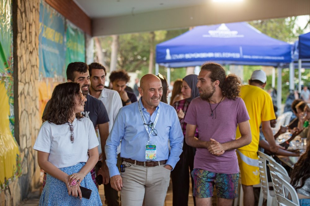 Kampta dünyayı yürüyerek turlayan gezgin Santiago Sanches Cogedor ile söyleşi etkinliği de yapıldı. Gençlerden gelen soruları yanıtlayan Cogedor, maceralarını anlattı. Etkinlikte Başkan Soyer de Cogedor’a bir soru yöneltti. Yaklaşık yüz ülke dolaşan Cogedor, Başkan Soyer’in, “Dünyanın, insanlığın geleceğine dair umudu arttı mı, azaldı mı?” sorusu karşısında, “Pozitif bir düşünceye sahip olmak lazım. Hepsinden önemlisi güzel şeyler yapmalı ve yaymalı. Bu yaptığımız etkinlik gibi. Gençler ve bizden sonra gelecek nesiller için çabalamalıyız. Onlara sahip olduğumuz çevrenin aynını ya da daha iyisini bırakmamız lazım, daha kötüsünü asla” cevabını verdi. Başkan Soyer bunun üzerine Cogedor'a, “Siyasetle ilgilenmeyi düşünüyorsa Türkçe öğretmeye hazırım” dedi.