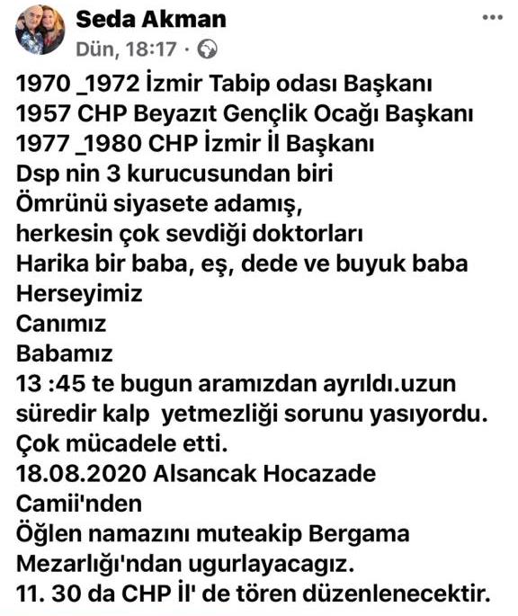 1977-1980 yılları arasında CHP İzmir İl Başkanlığı görevini yürüten Bergamalı Dr. Sedat Akman yaşamını yitirdi.