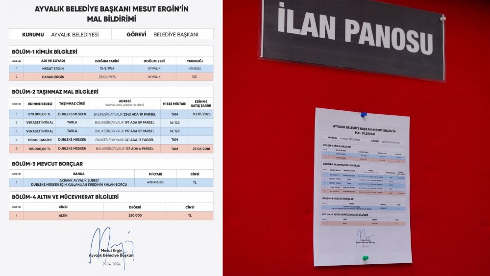 CHP Genel Başkanı Özgür Özel'in belediye başkanlarına mal varlığı açıklaması yönündeki çağrısına uyan Ayvalık Belediye Başkanı Mesut Ergin, kendisi ve eşi hakkında mal bildiriminde bulundu.