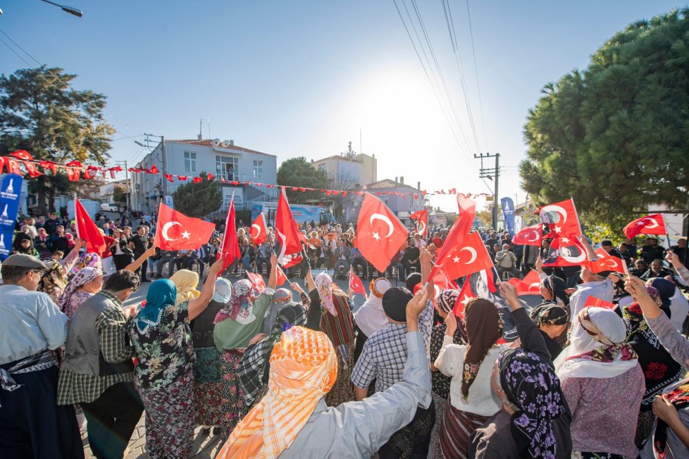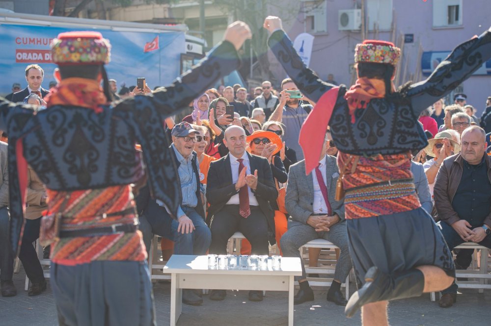 Köyde Cumhuriyet korteji oluşturuldu. Yürüyüşe İzmir Büyükşehir Belediye Başkanı Tunç Soyer de katıldı.