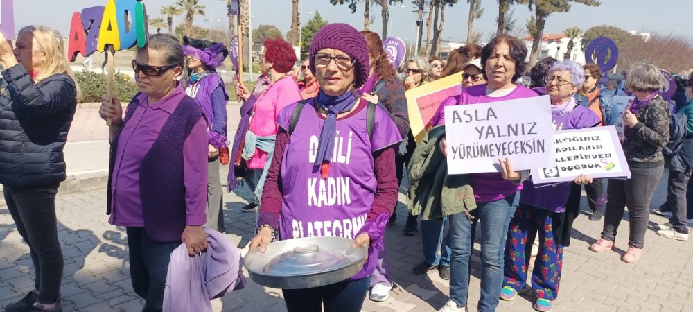 Dikili Kadın Platformu'nun çağrısıyla kadınlar, 8 Mart Dünya Emekçi Kadınlar Günü'nde Dikili sokaklarındaydı.