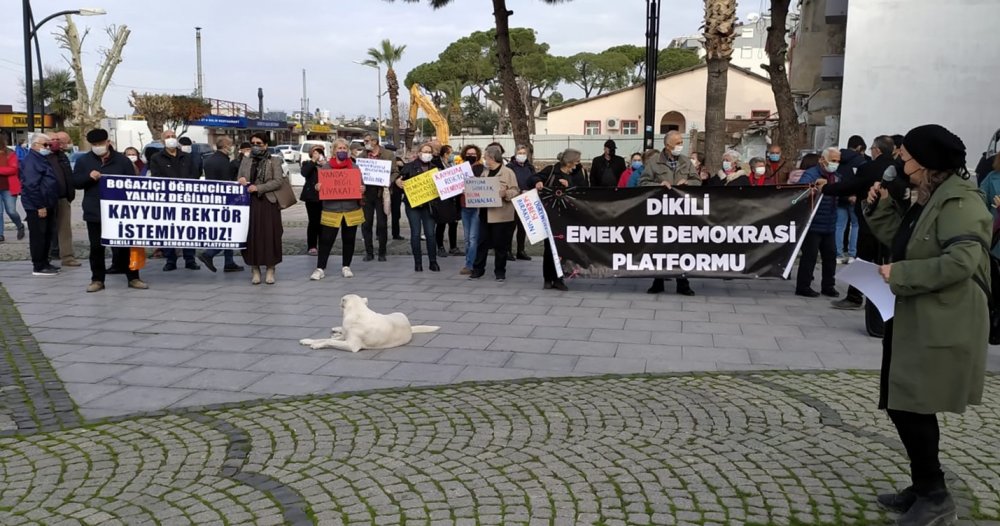 Basın açıklaması ise Dikili Eğitim-Sen Kadın Sekreteri Ezgi Yalçınkaya tarafından okundu. Açıklamada; “Bilindiği üzere, Cumhurbaşkanı Erdoğan Boğaziçi Üniversitesi’ne AKP’ye sadakati ile bilinen eski bir AKP milletvekili aday adayını rektör olarak atadı. Söz konusu atamayı kayyum olarak niteleyen Boğaziçi Üniversitesi bileşenlerinin demokratik tepkisine polisin sert müdahalesi gecikmedi. Atanan Rektör Melih Bulu ve polisin ilk icraatı ise kampüse girmek isteyen öğrencileri engellemek amacıyla (!) kampüs kapılarına kelepçe vurmak oldu” denildi.