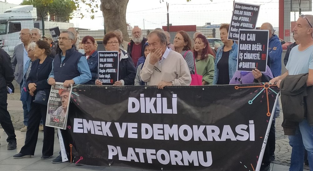 Dikili Atatürk Meydanı’nda bir araya gelen platform üyeleri “40 can kader değil, iş cinayeti”, “Bizler üşümeyelim diye onlar yandı”, “Dün Soma, bugün Bartın kader değil, iş cinayeti” ve “Kader değil katliam” yazılı dövizler taşıdı, “Çalışırken ölmek kader değildir!”, “Madden işçisi onurumuzdur!”, “İşçilerin birliği sermayeyi yenecek”, “İş kazası değil! Bu bir cinayet!” ve “Maden işçisi yalnız değildir” sloganları attı.