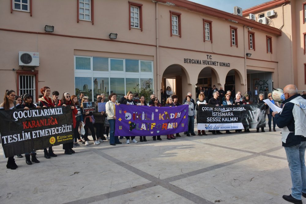 Açıklamada; “Ülke olarak bunlar yaşanırken birde taciz, istismar, cinsel saldırı gibi durumlarla karşı karşıyayız. Hemen her gün ülkemizin herhangi bir yerinde, çocuklarımız, canlarımız, en kıymetlilerimiz istismara, şiddete, her türden sömürü ve hak ihlallerine maruz kalıyorlar. Gün geçmiyor ki gerici tarikat/cemaat ve vakıflara ait ‘yurtlarda’ çocuklarımızın başına bir kötülük gelmesin. Biz bunları duyun diye çığlık atarken Marmara Üniversitesi’nde kendisine profesör unvanı verilen ve Üniversitede derslere giren bir şahıs çocuk evliliklerine izin verilmediği için -Allah bizi cezalandırdı ve Elazığ-Malatya depremi oldu- diyecek kadar hezeyan içerisinde. Freni boşalmış kamyon gibi gidiyor ve kimse sen ne diyorsun demiyor. Üniversite soruşturma açtım diyor. Ama derslere devam ettiğini ve evlilik yaşı ile ilgili derslerine başladığını sosyal medyadan paylaşıyor. Yani bu çocuk evliliği savunucusu söylemlerine devam ettiğini ve devam edeceğini haykırıyor. İşte bu ortamda Bugün yine Dikilili 12 yaşında bir kız çocuğumuzun tacizi davasındayız.”