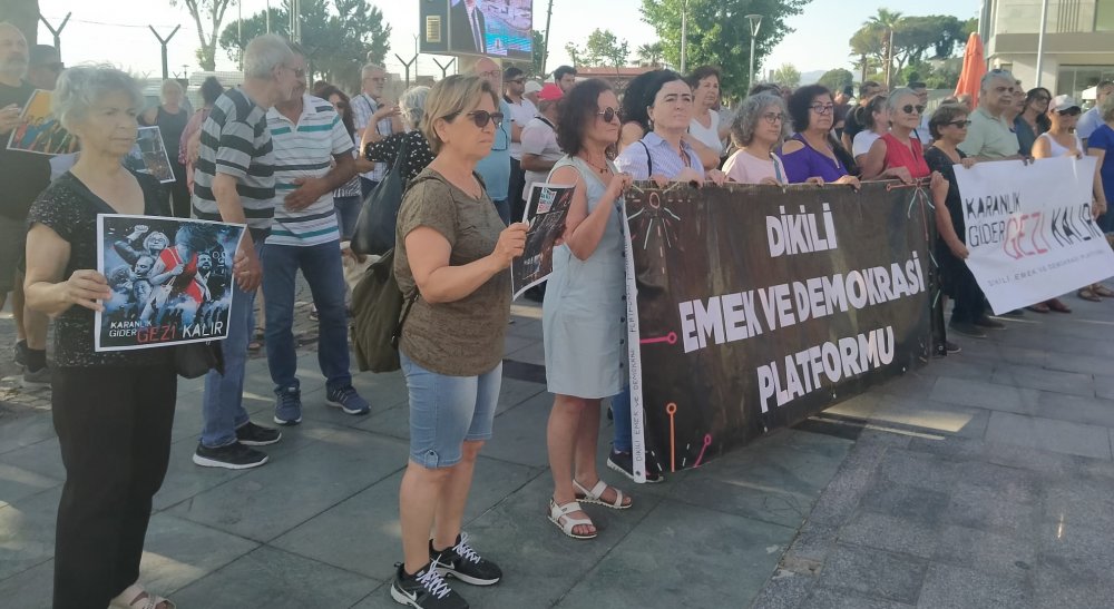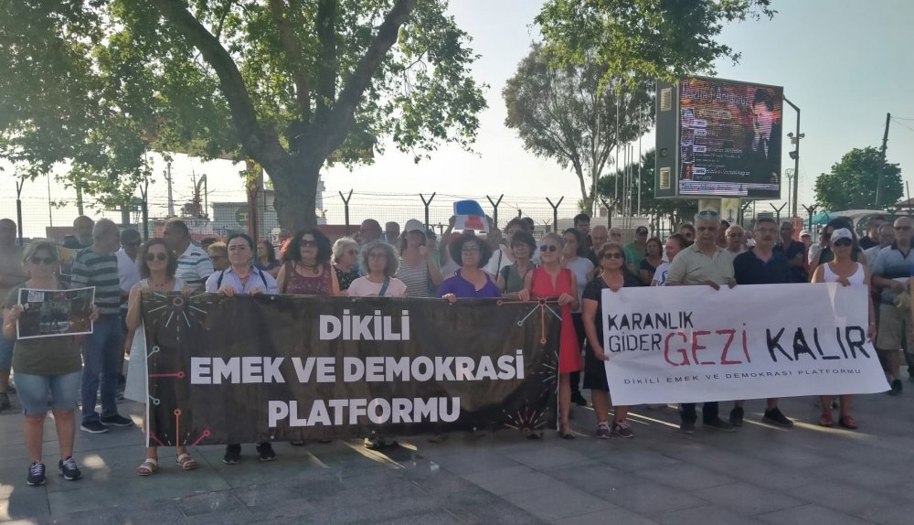 Dikili Atatürk Meydanı’nda gerçekleştirilen basın açıklamasını, Demet Önal ve Saner Kutan Ata'nın sunumuyla Ezgi Yalçınkaya okudu. Yapılan açıklama öncesi grup tarafından “Susmuyoruz, korkmuyoruz, itaat etmiyoruz”, “Her yer gezi, her yer direniş”, “Direne direne kazanacağız”, “Gezi halktır, yargılanamaz” sloganları atıldı.