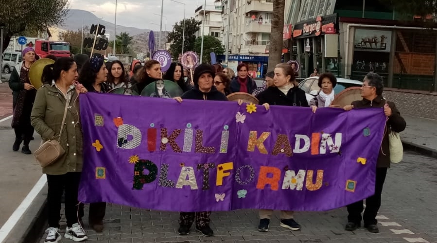 Dikili’de kadınlar, 25 Kasım Kadına Yönelik Şiddete Karşı Uluslararası Mücadele Günü’nde, eylem ve etkinliklerde eşit, özgür, şiddetsiz bir yaşam talebiyle haykırdı.
