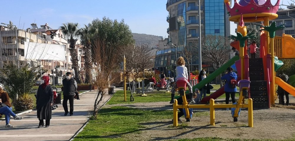 Pandemi nedeniyle sokağa çıkma yasakları, geçen haftaki soğuk havalar ve birkaç gün önce yaşanan sel felaketinin ardından Dikilili vatandaşlar güzel havanın tadını çıkarmak için park ve kumsallara akın etti.