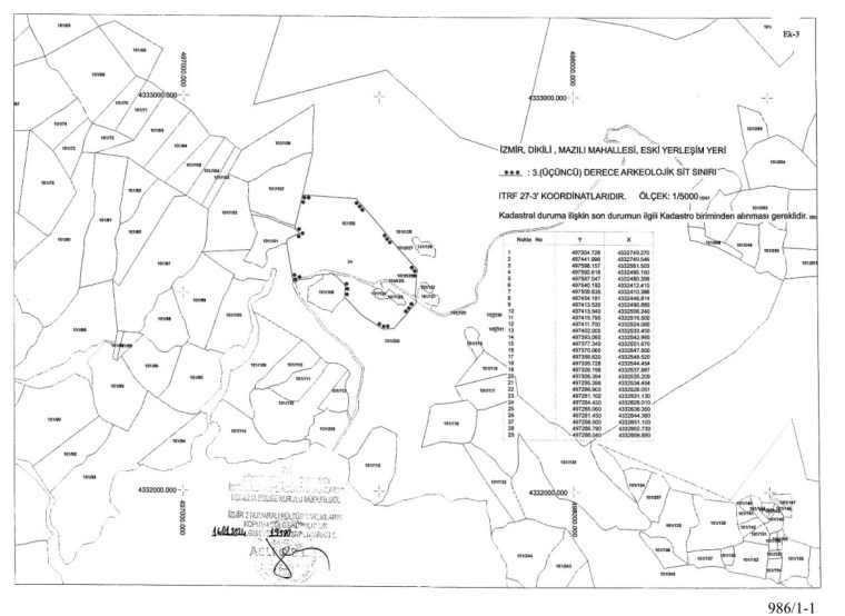 İzmir ili, Dikili ilçesi, Mazılı Mahallesinde Çimko Çimento ve Beton San. Tic. A.Ş tarafından yapılması planlanan Çimko Dikili GES (24MW e/25.28MW m) projesi kapsamında kurum görüşünün sorulduğu Çevresel Etki Değerlendirmesi, İzin ve Denetim Genel Müdürlüğü'nün 31.08/2023 tarih ve E-48331039-220.01-7269492 sayılı yazısı, yapılan yerinde inceleme sonrasında alanın bir bölümünün 2863 sayılı Kanunun 6. Maddesi kapsamında kalan korunması gerekli taşınmaz kültür varlıklarından olduğu hususlarının iletildiği Kurul Müdürlüğü uzmanlarınca hazırlanan 25.09/2023 tarih ve 2273287 sayı ile kayıtlı uzman raporu, alana ilişkin İzmir 2 Numaralı Kültür Varlıklarını Koruma Bölge Kurulunun alanın yerinde incelenmesine yönelik alınan 27.09.2023 tarih ve 18790 sayılı kararı, 3. (üçüncü) Derece Arkeolojik Sit Alanı olarak önerilen alan ve çevresinde Kurulumuzca yerinde yapılan inceleme sonrasında, alana ilişkin ilgili Kanunun 7. Maddesi kapsamında Kurul Müdürlüğünce tescil çalışmalarının başlatılmasına yönelik alınan İzmir 2 Numaralı Kültür Varlıklarını Koruma Bölge Kurulu'nun 31.10.2023 tarih ve 18965 sayılı kurul kararı, gelen kurum görüşleri ile Kurul Müdürlüğü uzmanlarınca hazırlanan 15.01.2024 tarihli ve 2486138 sayı ile kayıtlı rapor okundu, ekleri ve işlem dosyası incelendi, yapılan görüşmeler sonunda; İzmir İli, Dikili ilçesi, Mazılı Mahallesindeki, kararımız eki 1/5000 ölçekli kadastral pafta üzerinde işaretli alanın 3. (üçüncü) Derece Arkeolojik sit olarak tescil edilmesine, ekli tescil fişinin uygun olduğuna, karar verildi.