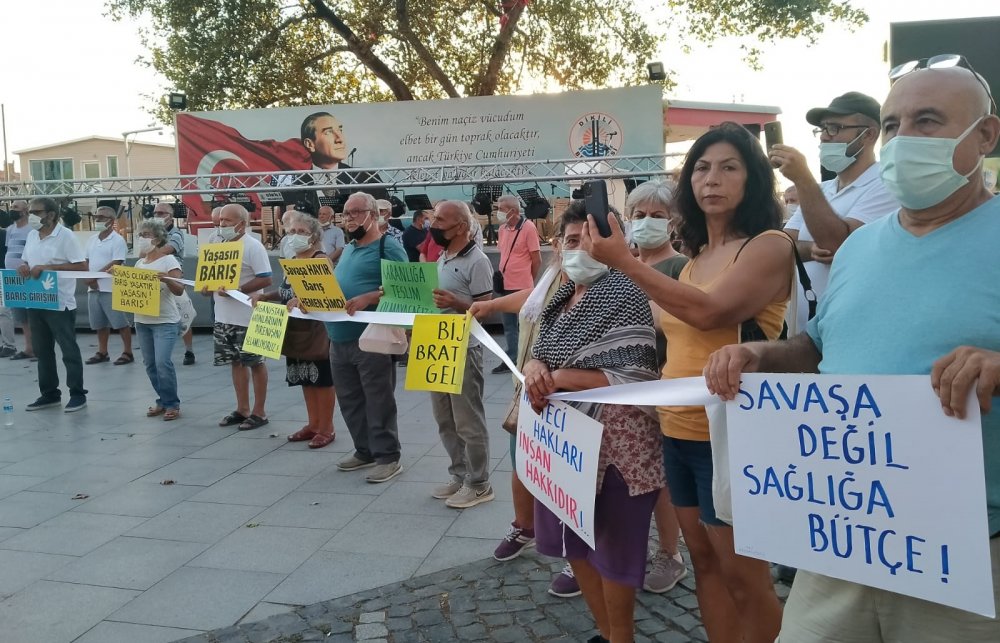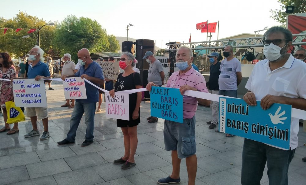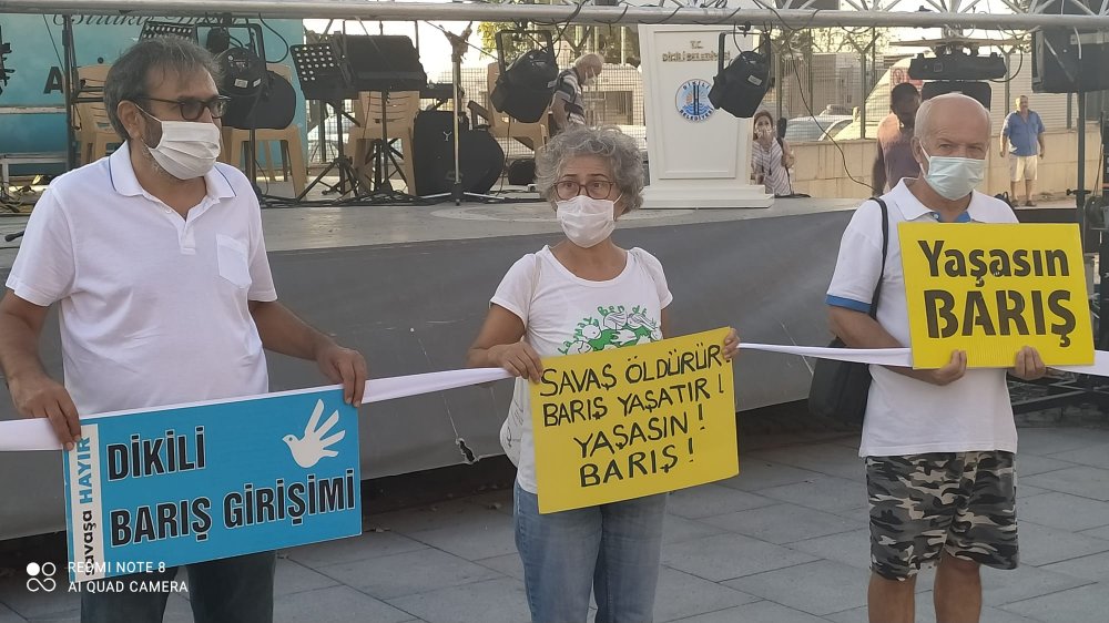 Dikili’de, 1 Eylül Dünya Barış Günü nedeniyle bir araya gelen vatandaşlar, ‘Barış’ diye haykırdı.