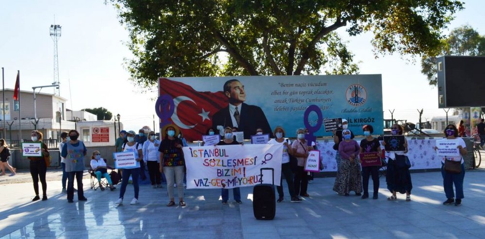 "İstanbul Sözleşmesi'nden vazgeçmiyoruz" diyen Dikili Kadın Platformu basın açıklaması düzenledi.