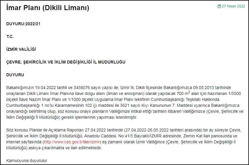 Onaylanan planlar, Çevre, Şehircilik ve İklim Değişikliği İl Müdürlüğü’nde (27.04.2022) 1 ay süreyle askıya çıkarıldı. ÇED olumlu kararı verilen projeye 26 Mayıs 2022 tarihine kadar itirazda bulunabilecek.