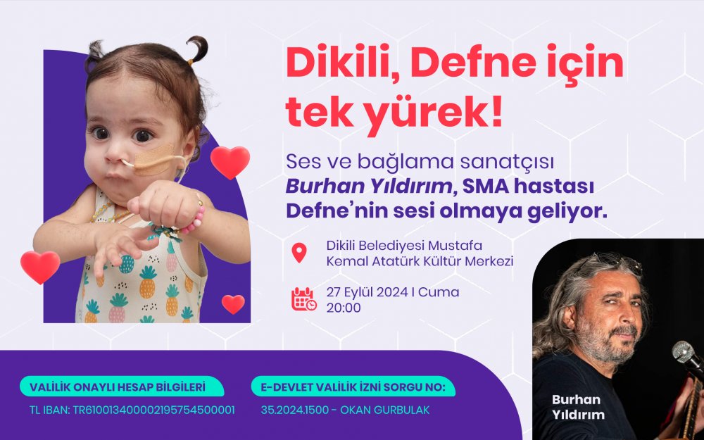 Minik Defne'nin yaşam mücadelesine destek olmak amacıyla 27 Eylül Cuma günü saat 20.00’da Mustafa Kemal Atatürk Kültür Merkezi’nde "Dikili Defne İçin Tek Yürek" yardım gecesi düzenleniyor.
