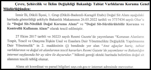 Çevre, Şehircilik ve İklim Değişikliği Bakanlığı Tabiat Varlıklarını Koruma Genel Müdürlüğü İzmir’in Dikili ilçesindeki doğal SİT alanlarına ilişkin yeni bir harita yayımladı. Resmi Gazete’de yayınlanarak askıya çıkarılan son değişiklikler ilçenin Bademli Köyü ve Karagöl bölgelerine ait.