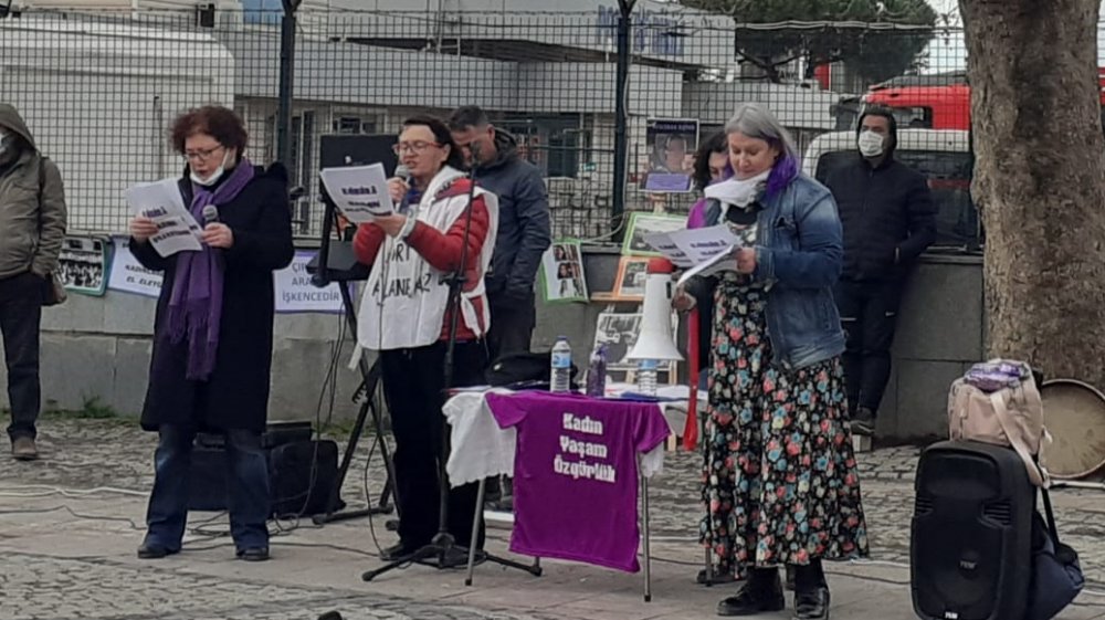 "Kadınların toplumsal özne olarak yaşamın içerisinde yer almasını istemeyen siyasal iktidar, yeni rejime uygun makbul kadın yaratma çabası ile muhalif kadınlar üzerindeki baskısını arttırıyor. Üniversite öğrencileri, siyasetçiler, sanatçılar, gazeteciler, kadın aktivistler, sendikal mücadele yürüten kadınlar; keyfi, hukuksuz gözaltı ve tutuklamalarla karşılaşıyor. Kürt kadınlar başta olmak üzere omuz omuza mücadele ettiğimiz birçok yol arkadaşımız hapishanelerde çıplak aramaya ve her türlü işkenceye maruz bırakılıyor. Aysel Tuğluk ve nice hasta mahpus kadınlar, sağlığı hapishanede kalmaya uygun olmadığı halde tahliye edilmiyor. Hasta kadın mahpusların sağlığa erişim hakkı engelleniyor. Biz bir kişi daha eksilmeyeceğiz. Aramızdan alınan her kadının hesabını soracağız. Birbirimizi bu erkek şiddetine karşı sarıp sarmalayacağız, koruyup kollayacağız. Kadınlara karşı düşman hukuku işleten erkek egemen devletten hesap soracağız. Birbirimizi savunduğumuz direniş dolu bir yılın ardından kaybettiğimiz tüm kadınlara LGBTİ+ lara, hapishanelerdeki tüm hasta kadın mahpuslara, sokakta evde işte okulda tacize tecavüze erkek şiddetine karşı yaşamak için mücadele veren tüm kadınlara, 8 Mart alanından bir kez daha söz veriyoruz: Birbirimizden güç alarak, birbirimize umut olarak, feminist mücadelemizi, kadın mücadelemizi sürdürüyoruz, sürdüreceğiz, bu bir yaşam mücadelesidir. Söyleyecek sözümüz, değiştirecek gücümüz var" sözlerine yer verildi.