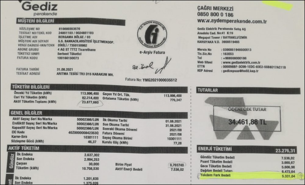 34 Bin 461 liralık Eylül ayı faturasında 5 bin 331 liralık bir kalem tespit eden yönetim, durumu anlamak için soluğu elektrik şirketinin Dikili Şubesi’nde aldı. Faturadaki fark burada açıklanamayınca Bergama’ya soruldu. Buradan da yanıt alınamadı.
