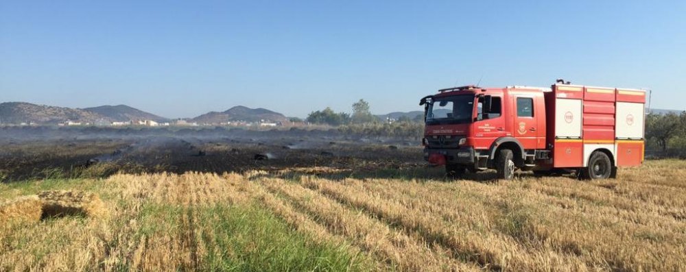 İtfaiye ekiplerince kısa zamanda kontrol altına alınan ve 49 dönümlük alanda çıkan yangında 100 zeytin ağacı ve 250 adet saman balyası kül oldu.