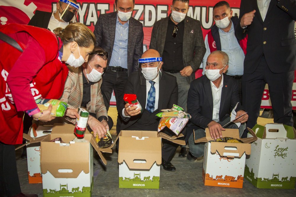 Sendikalı belediye personeli maaşlarından arttırarak aldıkları gıda paketlerini, ihtiyaç sahiplerine ulaştırılmak üzere Kültürpark 3 nolu holde kurulan lojistik merkezine “Umut Bizde Hayat Bizde Kent Yaşar Elimizde” sloganlarıyla getirdi.