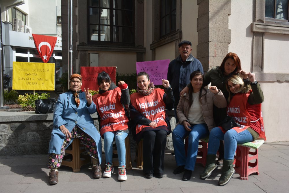 Anayasal hakkımız olan sendika seçme hakkımızı kullanarak üyesi olduğumuz sendika Disk Genel-İş'ten istifa etmedik diye, onlardan olmadık diye ve kısacası her söylenilene boyun eğmedik diye; soğuk bir Şubat gününde, sanki bunun aylardır planını yapmışız gibi aldık soluğu Belediye önünde.