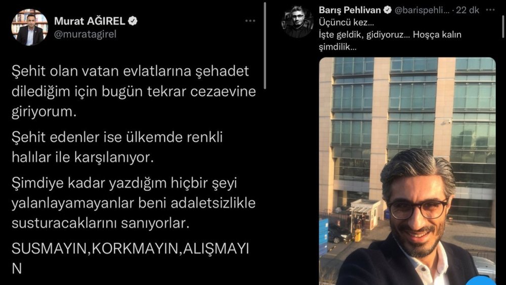 İnfaz savcılığına başvuru için Çağlayan’daki İstanbul Adliyesi’ne giden Murat Ağırel, Twitter hesabından yaptığı paylaşımda “Şehit olan vatan evlatlarına şehadet dilediğim için bugün tekrar cezaevine giriyorum. Şehit edenler ise ülkemde renkli halılar ile karşılanıyor. Şimdiye kadar yazdığım hiçbir şeyi yalanlayamayanlar beni adaletsizlikle susturacaklarını sanıyorlar. SUSMAYIN,KORKMAYIN,ALIŞMAYIN” ifadelerine yer verdi.