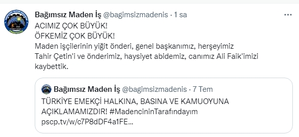CHP Grup Başkanvekili Özgür Özel de kazayı sosyal medya hesabından duyurdu: Maalesef çok acı bir haberle güne başladık. Hakları için yıllardır Soma'da ve günlerdir Ankara'da mücadele eden Bağımsız Maden-İş Genel Başkanı Tahir Çetin ve Ali Faik İlter kardeşimizi dönüş yolunda trafik kazasında kaybetmemizin tarifsiz üzüntüsü içindeyim. Başımız sağ olsun.