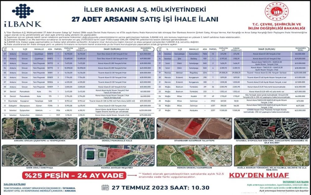 Yaptığı satışlar ile dikkat çeken Çevre, Şehircilik ve İklim Değişikliği Bakanlığı, Türkiye genelinde mülkiyeti İller Bankası'na ait 27 adet taşınmazı daha satışa çıkardı. Satışa çıkarılan taşınmazdan 2 tanesi İzmir'in Dikili ilçesinde bulunuyor.