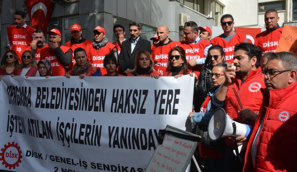 Bergama Belediyesi tarafından işten çıkarılan 3 kadın işçi Gonca Çetin, Nazlı Deniz Tan ve Alev Çakır’ın belediye önünde üzerlerinde “işimi istiyorum” yazılı yeleklerle ve mesai saatleri içinde sürdürdükleri hak arama eylemine DİSK Genel-İş İzmir 2 No’lu Şubeye bağlı işçilerde destek verdi. Yapılan basın açıklamasına 2 No’lu Şube Başkanı Arif Yıldız, 4 No’lu Şube Başkanı Aydın Tekin, Bergama Demokrasi Platformu; Bergama Çevre Platformu, Dikili Çevre Platformu ve Eğitim-Sen Bergama Şubesi üyeleri de katıldı.