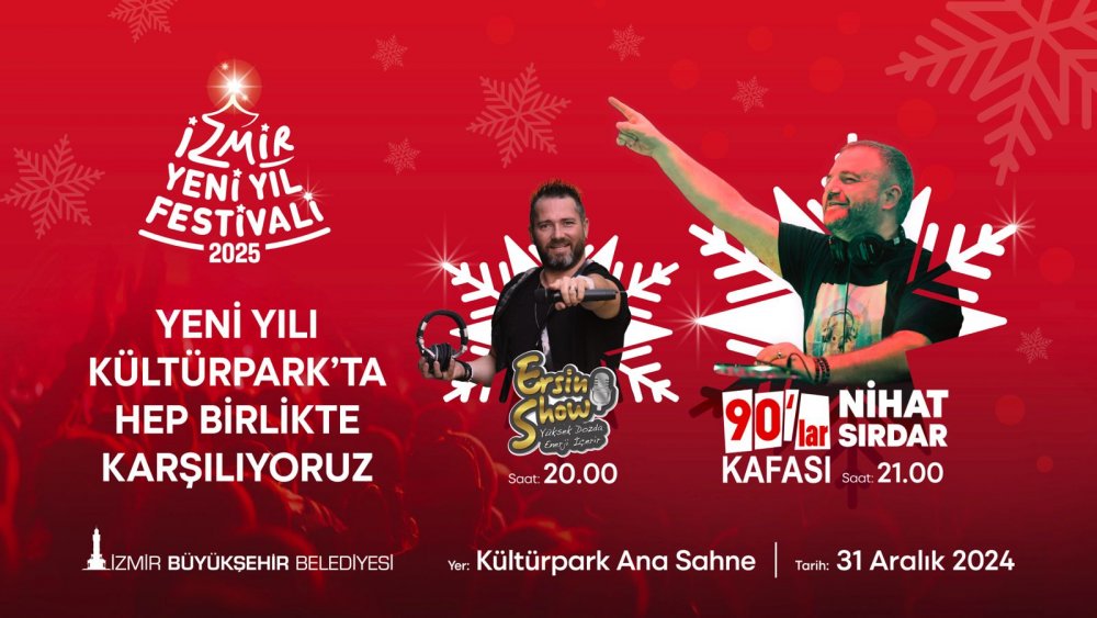 Hediyelik eşya stantları, yeme içme alanları, buz pateni, yaratıcı atölyeler ve İzmir’e özel sahne gösterileriyle sıcacık bir kış atmosferi oluşturan Yeni Yıl Festivali, Kültürpark’ta ziyaretçileri ağırlamayı sürdürüyor. Her gün 13.00-22.00 saatleri arasında yerel ve ulusal sanatçılarla müzik dinletileri ve konserler, dans, ritim şovları, ateş ve sirk sanatları gösterileri ve karaoke etkinliklerinin yapıldığı festival, muhteşem bir yılbaşı gecesi etkinliği ile taçlanıyor. Kültürpark Ana Sahne’de saat 17.00’de soft rock müzikle tanınan Grup E) Hiçbiri, 18.00’de pop müzik sevenler için Grup Lambda, 20.30’da müzik, dans ve interaktif gösteri ile Ersin Show, 22.00’de ise Nihat Sırdar 90’lar Kafası var. Ünlü radyo programcısı Nihat Sırdar, 90’ların unutulmaz parçalarını DJ setinden dinlemek isteyenleri dans ve eğlence dolu bir gecede coşturacak.