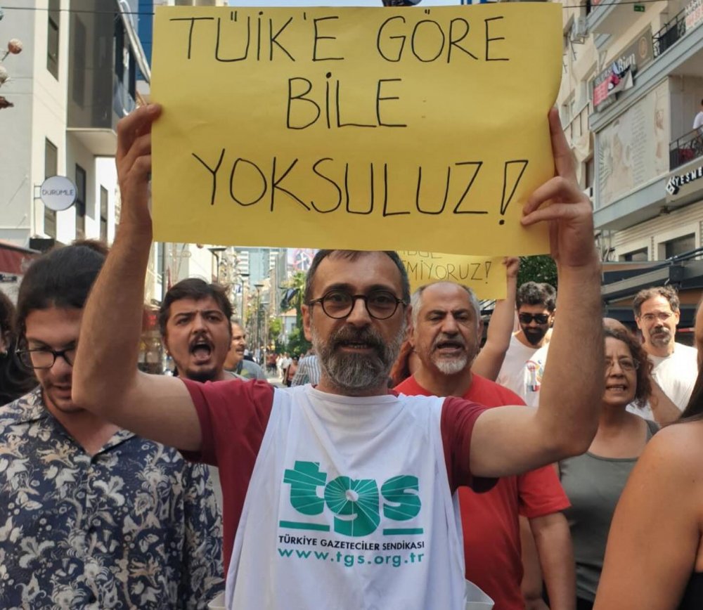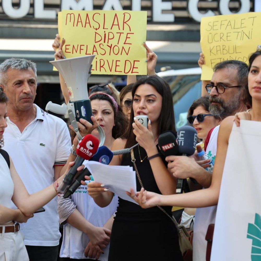 Asgari ücrete ara zam yapılmaması üzerine ülkenin dört bir yanında artan ‘geçinemiyoruz’ eylemlerine bir ses de basın emekçilerinden geldi. Türkiye Gazeteciler Sendikası İzmir Şubesi, basın emekçilerinin sesi olmak için Alsancak Türkan Saylan Kültür Merkezi önünde bir basın açıklaması düzenledi. Düzenlenen basın açıklamasına İzmir’deki gazeteciler ve Sivil Toplum Kuruluşları da katıldı. Düzenlenen ortak basın açıklamasını, Türkiye Gazeteciler Sendikası İzmir Şube Başkanı Nil Kahramanoğlu yaptı. Kahramanoğlu, “Türk-İş’in Haziran verilerine göre Türkiye’de açık sınırı 18 bin 978 lira. Yılın başında asgari ücret seviyesine getirilen maaşlarımızla ayakta kalmaya çalışıyoruz. Aldığımız yemek ücretleriyle 10 gün yemek yiyemiyoruz. Yani karın tokluğuna bile çalışmıyoruz. Tüm bu kötü tabloya rağmen üç kuruşa, kalemimizi satmadan, mesleğimizin ilkelerini yerine getirmeye mücadele ediyoruz” şeklinde konuştu.