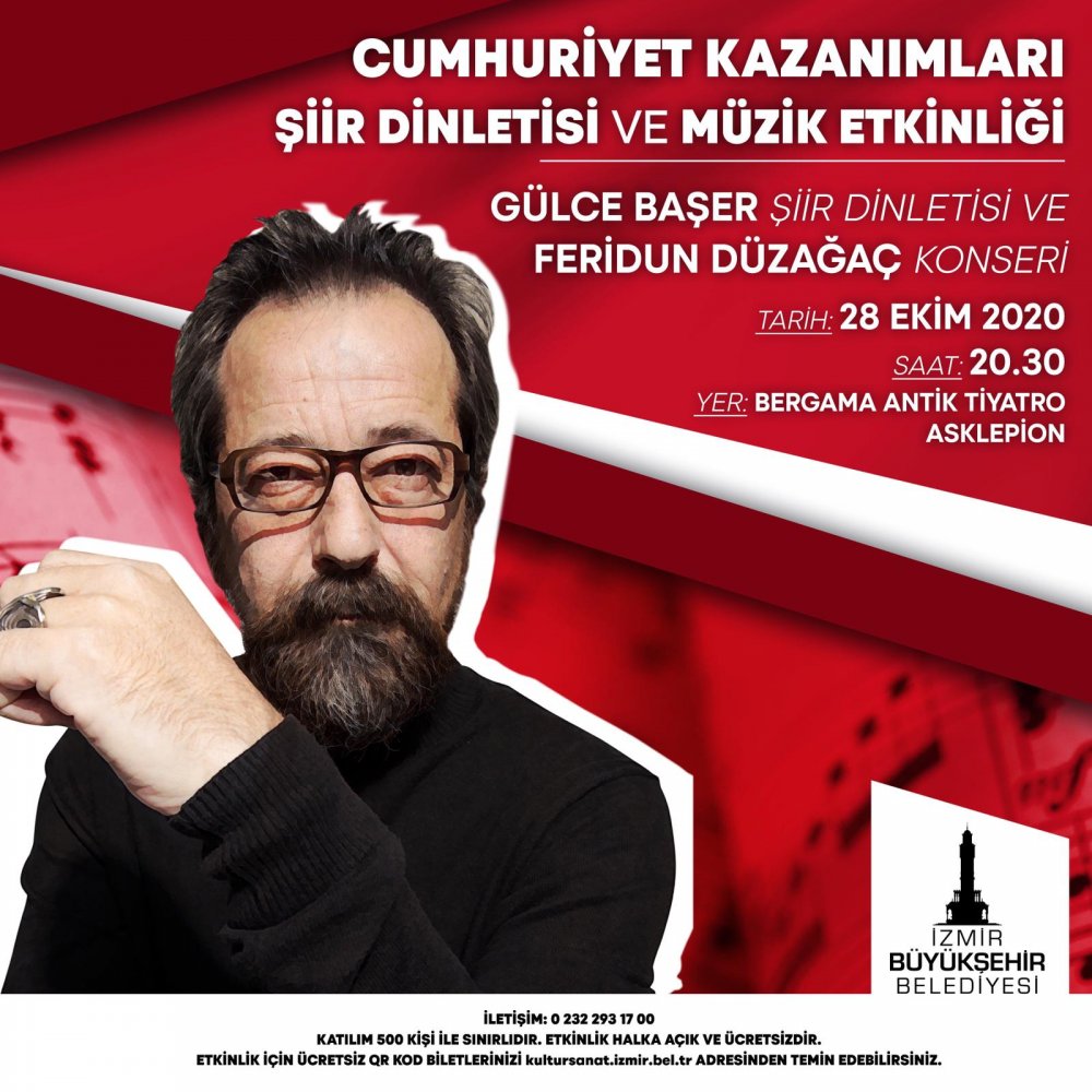 İzmir Valiliği tarafından pandemi önlemleri kapsamında 29 Ekim’de Bergama Antik Tiyatro’daki Feridun Düzağaç ve Gülce Başer’in katılacağı Cumhuriyet kazanımlarını anlatan şiir dinletisine izin verilmedi.
