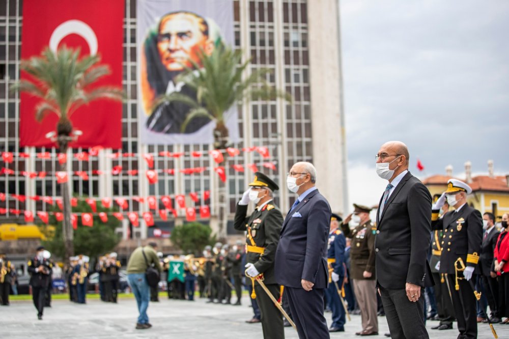 Törende Cumhuriyet Meydanı'ndaki Atatürk Anıtı'na İzmir Valiliği, Ege Ordusu ve Garnizon Komutanlığı ile İzmir Büyükşehir Belediyesi'nin çelenkleri konuldu. Tören, saygı duruşu ve İstiklal Marşı'nın ardından son buldu.