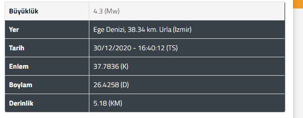 İzmir'in Urla ilçesinde saat 16.40'ta 4.3 büyüklüğünde bir deprem meydana geldi.
