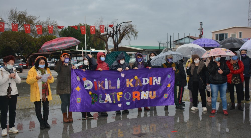 Atatürk Meydanı'nda yapılan basın açıklamasına Dikili Kadın Platformu, Dikili Kent Konseyi Kadın Meclisi ve Dikili Emek ve Demokrasi Platformu katıldı. Basın açıklaması öncesinde; "Yaşasın Kadın Dayanışması", "Susmuyoruz, korkmuyoruz, itiat etmiyoruz", "Haklarımızdan vazgeçmiyoruz", "Kadın cinayetlerine karşı ses çıkarıyoruz", Haklarımıza göz dikenlere karşı ses çıkarıyoruz", İstanbul Sözleşmesini kaldıranlara ses çıkarıyoruz" ve "Faşizme karşı omuz omuza" sloganları atıldı.