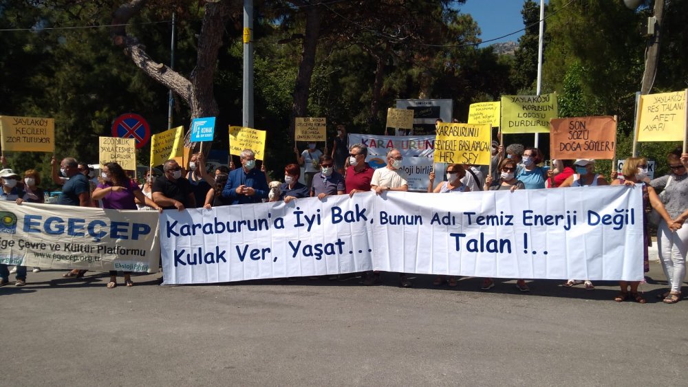 "Böylesi, doğaya, insana hoyrat bir uygulamayla 'yenilebilir-temiz enerji' adı altında bu nadir doğanın, yaban hayatının, tarım, mera ve turizm alanlarımızın kısacası Karaburun’da yaşamın yok edilmesine rıza göstermeyeceğiz. Biz Karaburunlu yurttaşlar olarak; yarımadamızın doğasını, tüm canlıların yaşamını, insan sağlığını, bugününü ve geleceğini, koruyarak/ kalkınma ilkesini hiçe sayarak sadece bir enerji üretim alanına dönüştürülmesine karşı, bugünümüz ve gelecek kuşaklar adına davacıyız ve her türlü yasal hakkımızı, dün olduğu gibi bugün de kullanmaya devam edeceğimizi kamuoyuna ilan ediyoruz" denildi.