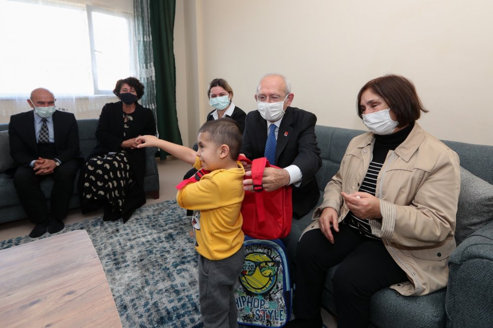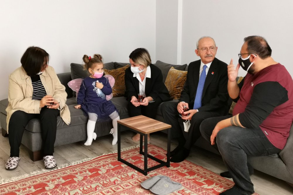 Kılıçdaroğlu’na depremzedelerden Türkyıldırım ve Albayrak ailelerini ziyaretinde pandemi önlemleri nedeniyle yalnızca eşi Selvi Kılıçdaroğlu, CHP Genel Sekreteri Selin Sayek Böke, İzmir Büyükşehir Belediye Başkanı Tunç Soyer, eşi Neptün Soyer ve Karabağlar Belediye Başkanı Muhittin Selvitopu eşlik etti. Ziyarette, Kılıçdaroğlu depremzedelere geçmiş olsun dileklerini iletti, çocuklara da oyuncak hediye etti.
