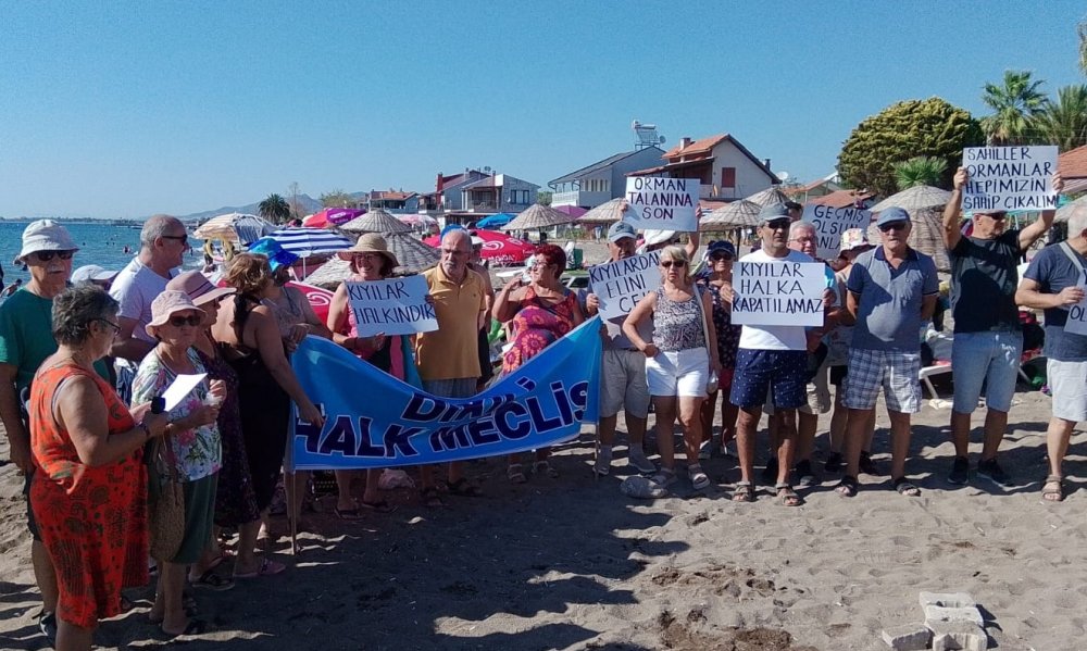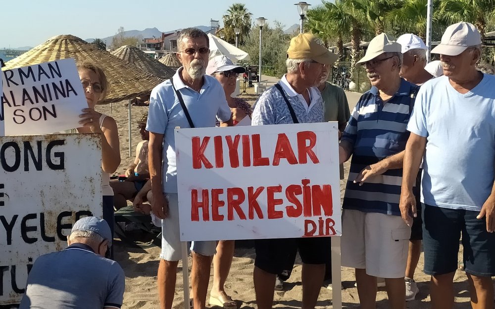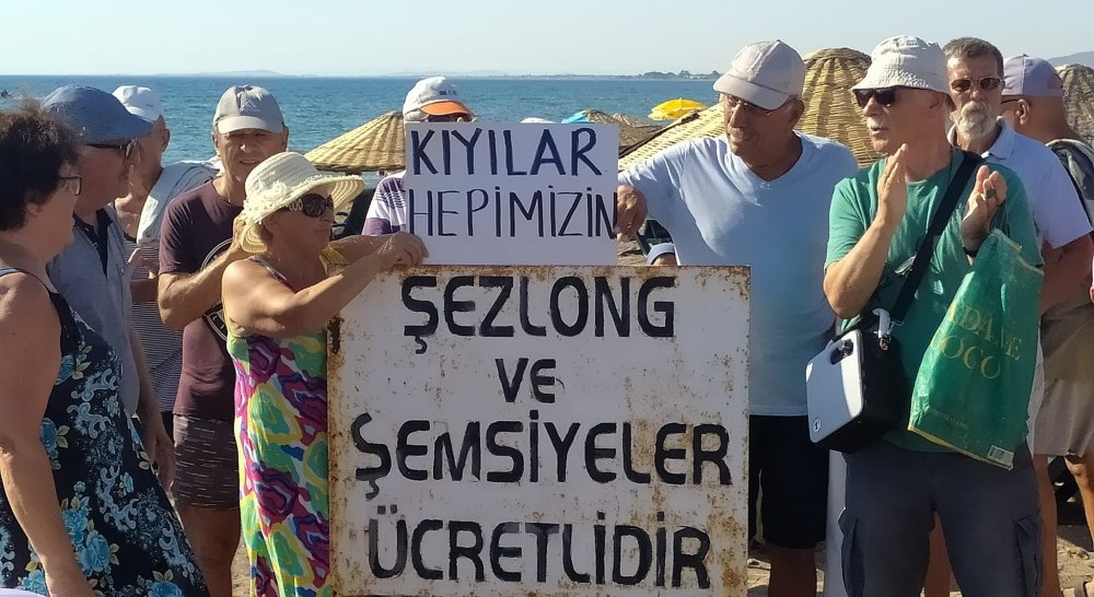 Dikili Halk Meclisi'nin de destek verdiği basın açıklamasında kumsalda bulunan "Şezlong ve Şemsiyeler ücretlidir" yazısının yanına "Kıyılar herkesin" yazılı döviz bırakıldı.