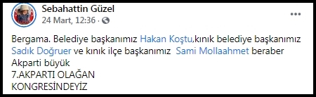 AKP'nin 7. Olağan Büyük Kongresi'ne katılan Bergama İlçe Başkanı Sebahattin Güzel'in Covid-19 testi de pozitif çıktı.