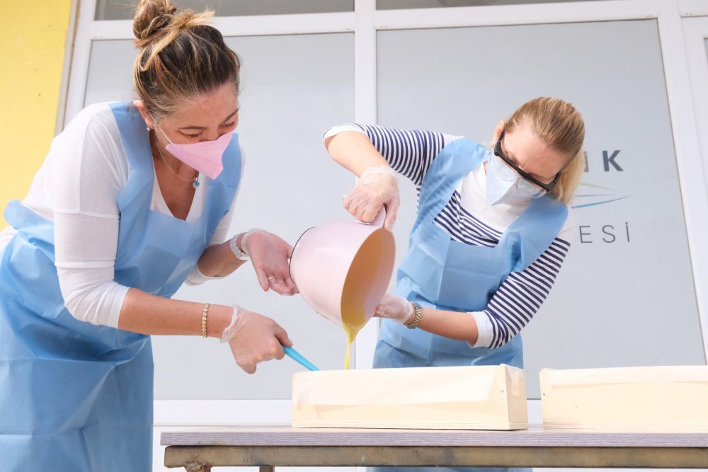 Ayvalık Belediye Başkanı Mesut Ergin’in, "Kadınlara gelir kapısı olacak önemli projelerimden" dediği mahalle evlerinde geliştirilen projelerden biri olan sabun üretimine Ayvalık Belediye Başkanı Mesut Ergin’in eşi Canan Ergin de katılarak kadınlara eşlik etti.