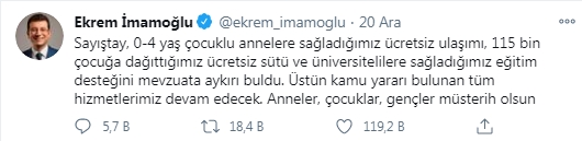 İstanbul Büyükşehir Belediye Başkanı Ekrem İmamoğlu ise Twitter sayfasından dün şu açıklamayı yapmıştı: “Sayıştay, 0 – 4 yaş çocuklu annelere sağladığımız ücretsiz ulaşımı, 115 bin çocuğa dağıttığımız ücretsiz sütü ve üniversitelilere sağladığımız eğitim desteğini mevzuata aykırı buldu. Üstün kamu yararı bulunan tüm hizmetlerimiz devam edecek. Anneler, çocuklar, gençler müsterih olsun.”
