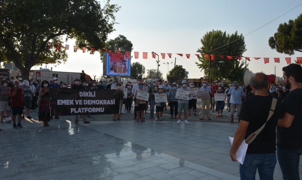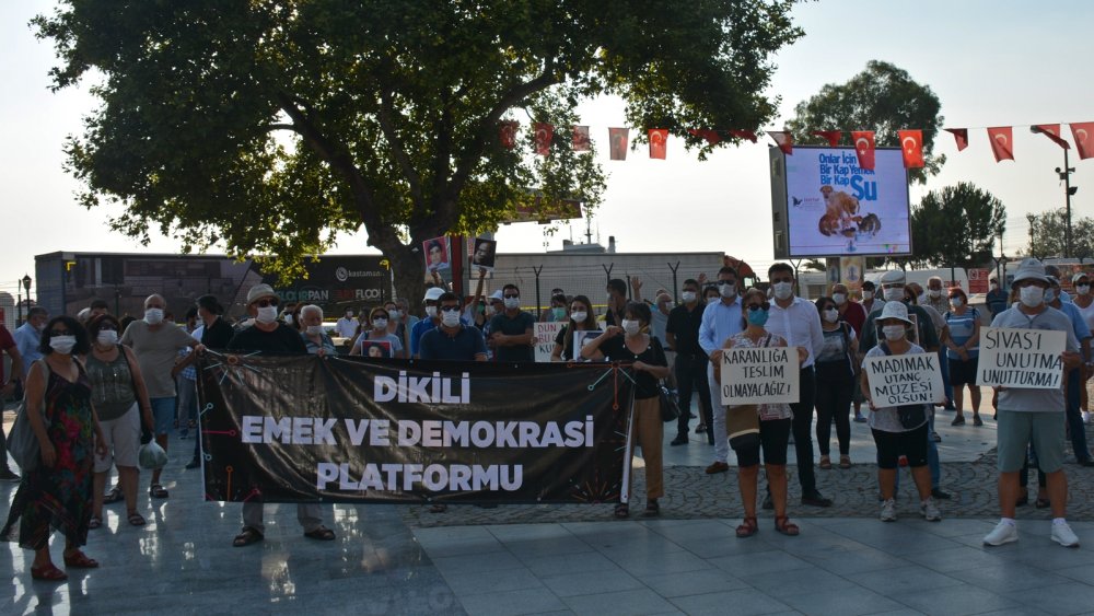 Dikili Alevi Kültür Derneği Gençlik Kolları Başkanı Yusuf Can Gözcü tarafından yapılan basın açıklamasında ise; “İnsanlık tarihine kara bir leke olarak geçen Sivas katliamının üzerinden 27 yıl geçti, katliam ateşi, 27 yıldır yüreklerimizi yakmayı sürdürüyor. Tarihte insanlığı hedef alan Kerbela’dan beri en acımasız katliamlardan biri olan madımak katliamı, insanım diyen, insan olma onurunu taşıyan herkesin içinde hiç dinmeyecek bir acı ve hiç kapanmayacak bir yara bırakmıştır. Ve o yara hala kanamaktadır” denildi.