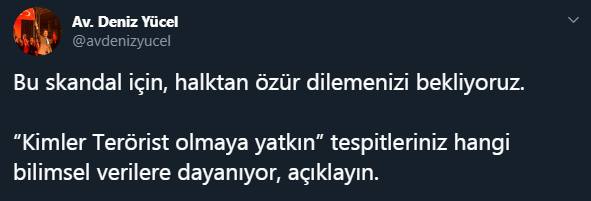 CHP İzmir İl Başkanı Avukat Deniz Yücel de seminerde ifadelere tepki göstererek, "Bu skandal için, halktan özür dilemenizi bekliyoruz.'Kimler Terörist olmaya yatkın' tespitleriniz hangi bilimsel verilere dayanıyor, açıklayın." notunu düşerek söz konusu haberi paylaştı.