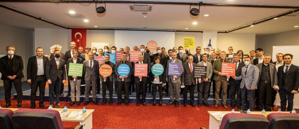 İzmir Büyükşehir Belediyesi’nin Birleşmiş Milletler Kadın Birimi (UN Women) işbirliğiyle Türkiye’de ilk kez kamuda karar alma mekanizmasında yer alan erkek yöneticiler için yapılan atölye çalışmasına Başkan Tunç Soyer ile birlikte Birleşmiş Milletler Kadın Birimi’nde görevli Programlar Koordinatörü Zeliha Ünaldı, İzmir Büyükşehir Belediyesi Genel Sekreteri Dr. Buğra Gökçe, ESHOT Genel Müdürü Erhan Bey, Büyükşehir Belediyesi’nin erkek genel sekreter yardımcıları, Büyükşehir, ESHOT ve İZSU'da görevli daire başkanları, genel müdür yardımcıları ve teftiş kurulu başkanları katıldı.