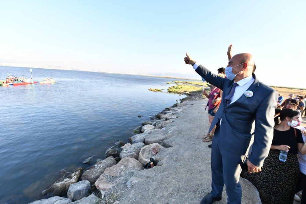 Yola çıkarken “Sadece bize oy veren insanların değil; flamingoların, toprağın, suyun, havanın, ormanın da başkanı olacağım” sözünü verdiğini hatırlatan Soyer, “Bu söz, öylesine söylenmedi. İzmir’in yeni yol haritasına, doğayla uyumlu yaşamına ve İzmir’in tüm değerlerinin korunmasına işaret ediyor. İzmir’de sadece farklı fikir ve kültürlerden insanların uyum içinde yaşadığı değil; insanların, doğayla ve diğer tüm varlıklarla barış içinde hayat süreceği bir şehir iklimi yaratmayı hedefledik. Gediz Deltası, bunun en güzel örneği. Şehrin merkezinde flamingoların dansını, onlarca farklı kuş türünü ve canlıyı gördüğünüz çok özel bir alan. Şunu idrak etmemiz gerekiyor artık. Biz insanlar da dahil tüm canlıların yaşam hakkı, parçalanmaz şekilde bir bütün. Biz doğanın sahibi değil, parçasıyız. Bug& uuml;n küresel anlamda yaşadığımız ekolojik krizlerin sebebi, tam da insan eliyle yaşanan tahribatlar. Oysa unutmamamız gerekiyor; doğa hasta olursa, biz de hastayız. O iyiyse, biz de iyiyiz. İçecek suyumuz, soluyacak havamız, karnımızı doyuracak topraklarımız kalmadığında, zaten hiç kimse için binaların, rantın ve paranın bir önemi kalmayacak. Bu sebeple flamingoların dansına şahit olduğumuz, tepeli pelikanlar, balıkçıllar, karabataklar ve Akdeniz martılarıyla iç içe yaşadığımız bu özel alan ile ilgili bir rant projesine asla izin vermeyeceğiz” dedi.